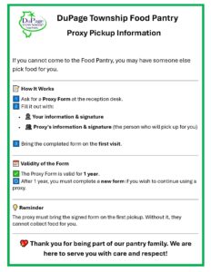 If you cannot come to the Food Pantry, you may have someone else pick food for you. Info on proxy forms: